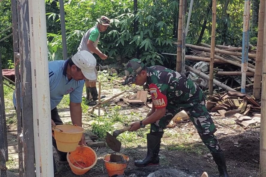 Serda Muis, turun langsung ke lapangan membantu proses pembangunan gazebo yang nantinya akan dimanfaatkan sebagai sarana berkumpul dan berinteraksi warga. Kehadiran Babinsa di tengah masyarakat tidak hanya sebagai aparat kewilayahan, namun juga sebagai penggerak kebersamaan dan kepedulian sosial.