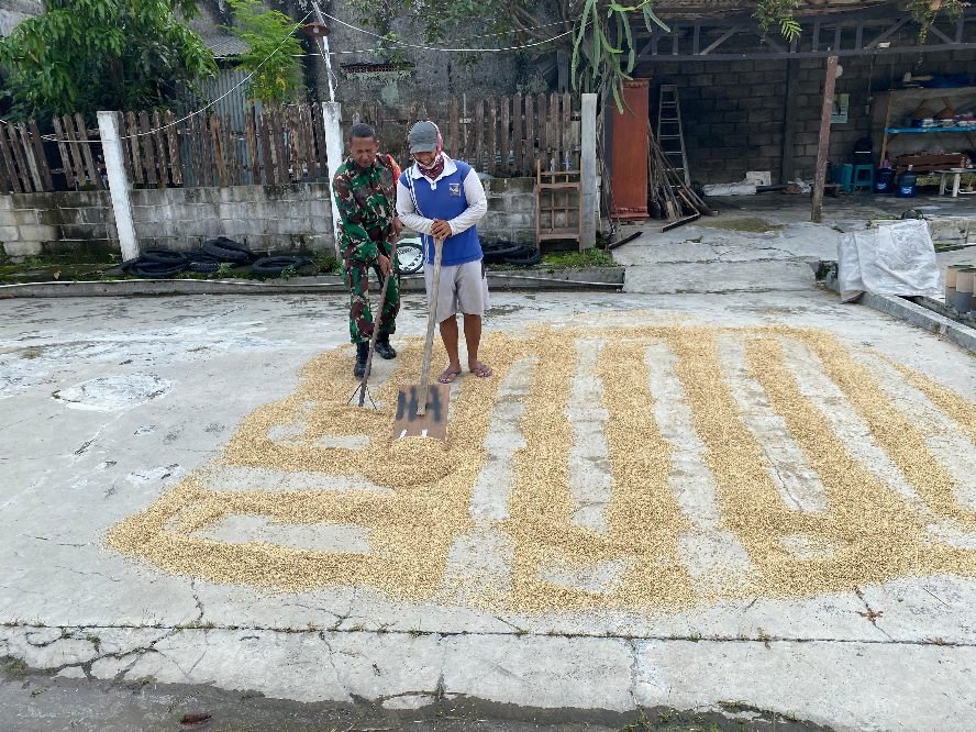 Dengan menggunakan halaman terbuka yang tersedia, para petani bersama Babinsa bekerja sama menjemur gabah hasil panen agar mencapai tingkat kekeringan optimal sebelum digiling.