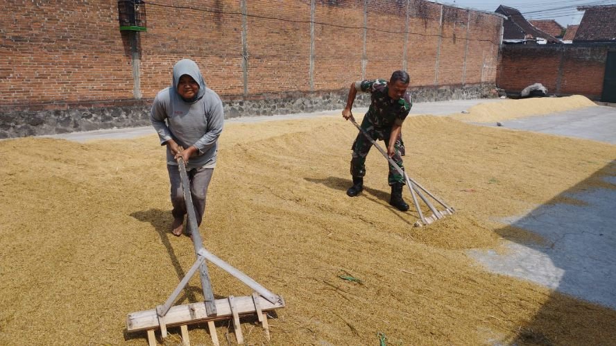 Sketsamalang.com – Babinsa Koramil 0833 – 03/ Blimbing, Kelurahan Balearjosari, membantu warga binaannya menjemur padi hasil panen di lahan milik warga, Senin (1/9/2025),