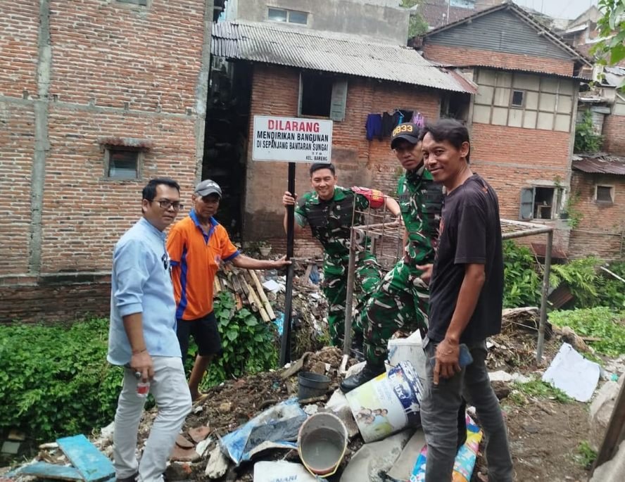 Sketsamalang.com – Babinsa Kelurahan Bareng, Koramil 0833-01/Klojen, bersama warga setempat memasang papan himbauan larangan mendirikan bangunan di bantaran Sungai Bareng Tenes, Kota Malang, Jumat sore (24/10/2025).