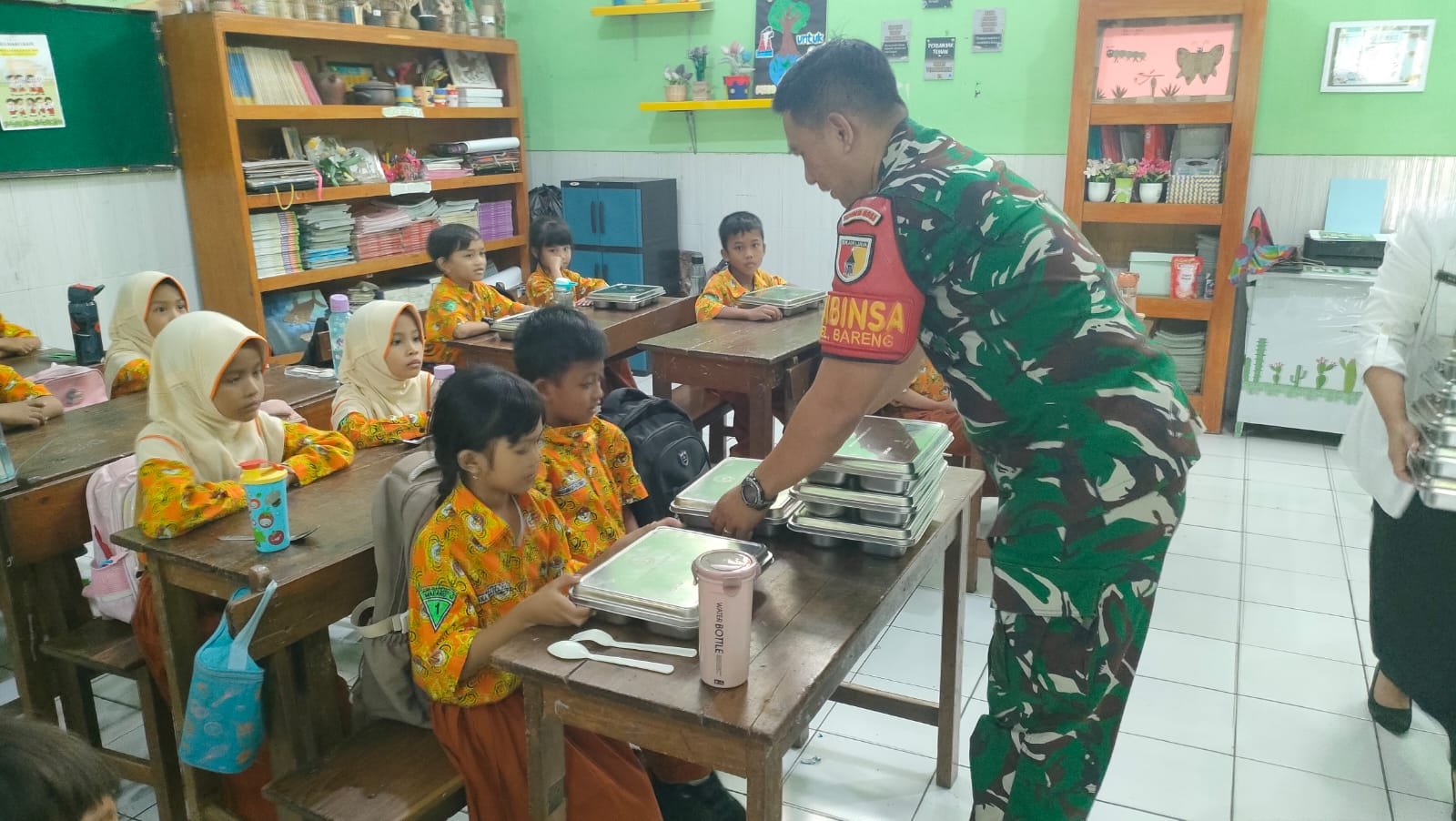 Sketsamalang.com – Babinsa Koramil 0833-01/Klojen, Serda Putu melaksanakan pendampingan penyaluran Makanan Bergizi Gratis (MBG) kepada siswa di Kelurahan Bareng, Kecamatan Klojen, Kota Malang. Untuk memastikan bantuan tersebut tersalurkan dengan aman, tertib, dan tepat sasaran, Kamis (29/1/2026).