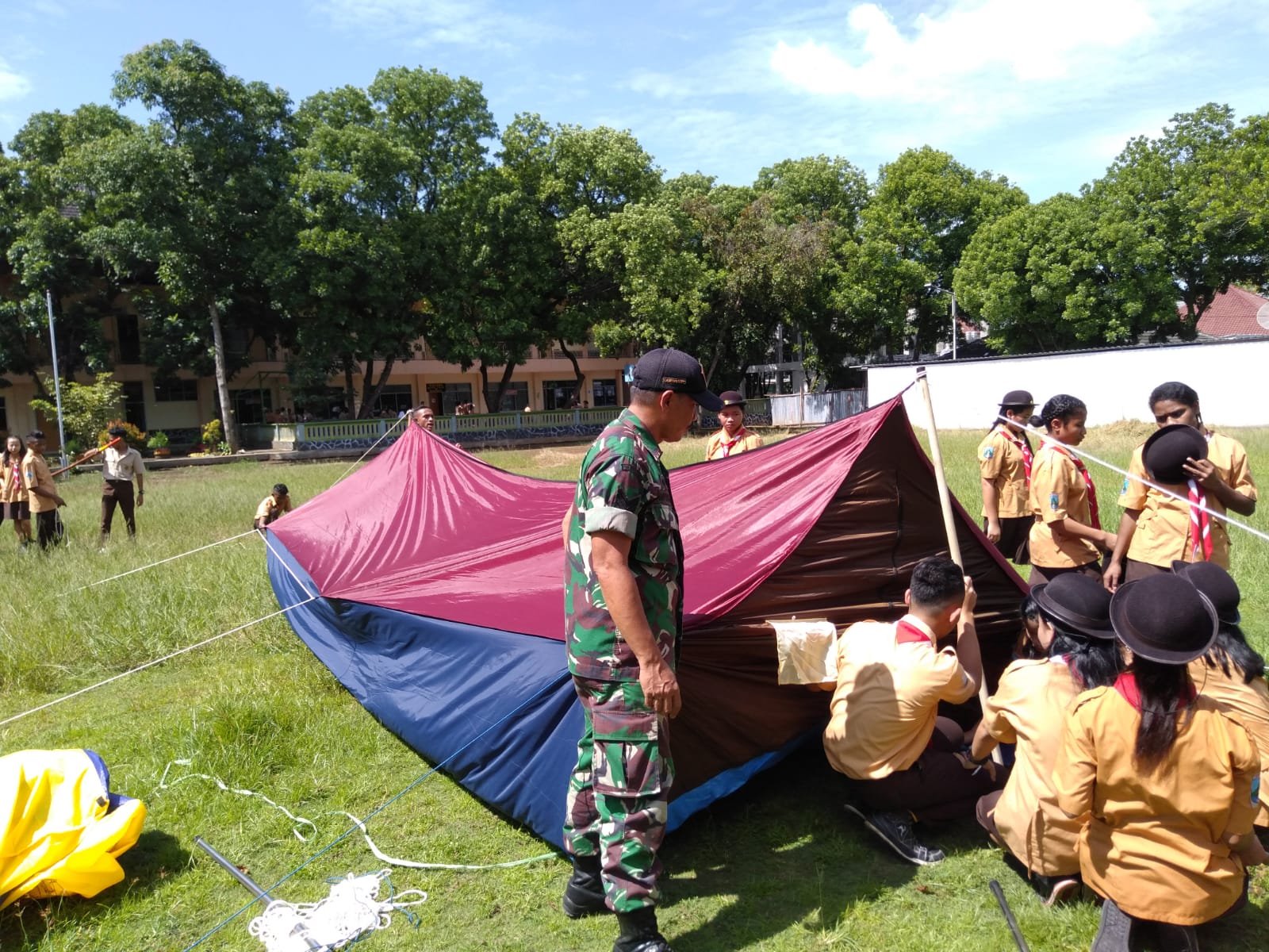 Sketsamalang.com – Babinsa Koramil 0833/04 Sukun Kelurahan Pisangcandi Serma Hariyanto. Bersama Guru pendamping memberikan pelatihan tata cara pemasangan tenda pramuka kepada murid SMK Bhakti Luhur Pisangcandi.