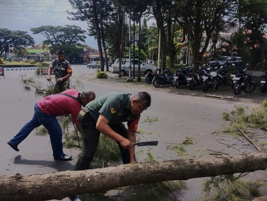 Pohon cemara berukuran setinggi ± 20 meter diameter ± 25 cm tersebut tumbang akibat akar pohon yang rapuh dan berpotensi membahayakan keselamatan pengguna jalan. Menyikapi hal itu, Babinsa bersama petugas DLH dan warga sekitar bergerak cepat melakukan penanganan dengan memotong dan membersihkan material pohon agar arus lalu lintas kembali aman dan lancar.