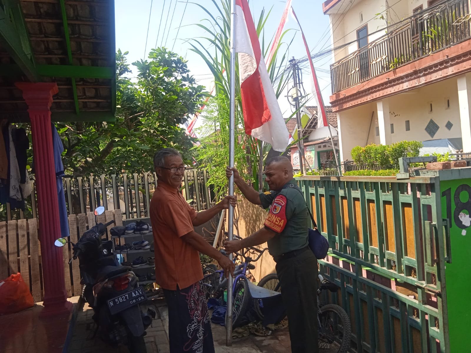 Sketsamalang.com – Babinsa Koramil 0833/04 Sukun Kelurahan Bandungrejosari, Serka Alfred mendampingi pemasangan umbul-umbul dan Bendera. Bentuk kepedulian dan partisipasi dalam memupuk semangat patriotisme.