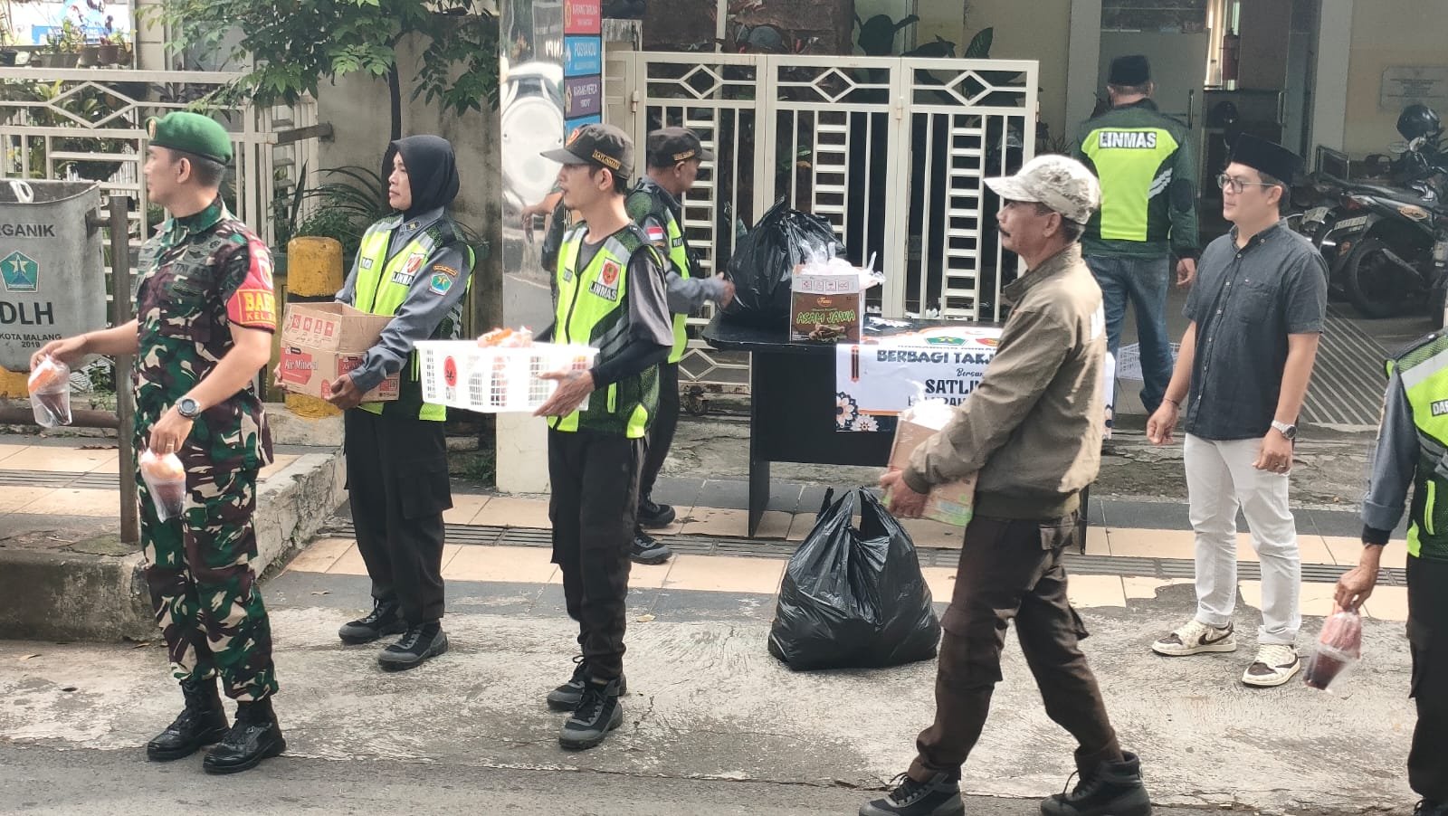 Sketsamalang.com – Babinsa Koramil 0833/01 Klojen Kelurahan Bareng Kota Malang, bersama anggota Linmas Kelurahan Bareng, membagikan takjil gratis kepada pengguna jalan yang melintas di sepanjang jalan utama Kantor Kelurahan Bareng.