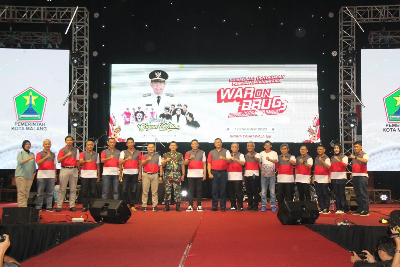 Sketsamalang.com – Komandan Kodim 0833/Kita Malang Letkol Arm Aris Gunawan bersama Forkopimda Kota Malang menghadiri kegiatan Sosialisasi Penyadaran Pemuda Anti Narkoba bertajuk “War On Drugs“.