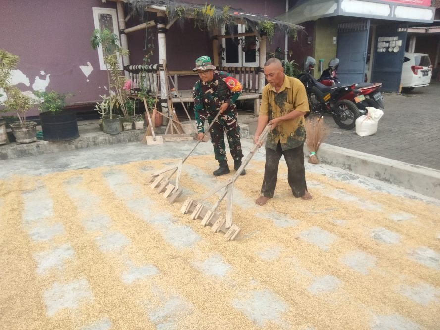 Dengan menggunakan halaman terbuka yang tersedia, para petani bersama Babinsa bekerja sama menjemur gabah hasil panen agar mencapai tingkat kekeringan optimal sebelum digiling.