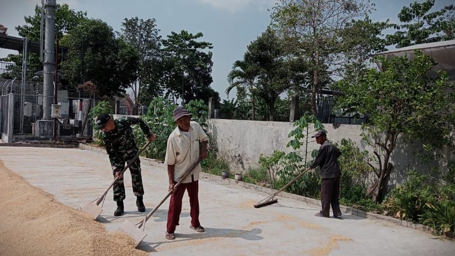 Gabah dijemur di halaman milik kelompok tani dengan cara tradisional di halaman rumah serta dibntu terik matahari. Para petani mengaku terbantu dengan kehadiran Babinsa yang turut aktif sejak panen hingga pasca panen.