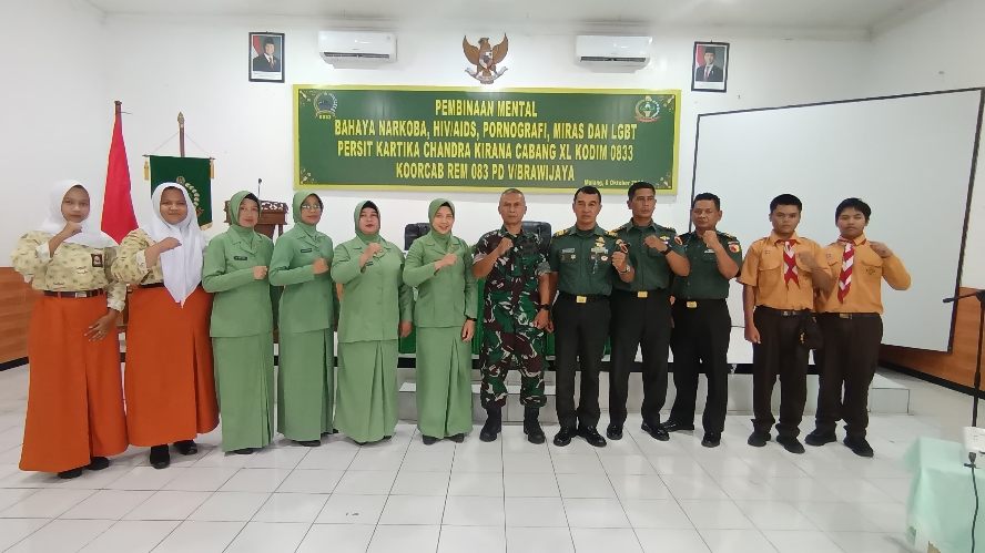 Sketsamalang.com – Kodim 0833/Kota Malang menyelenggarakan kegiatan pembinaan mental yang difokuskan pada pencegahan bahaya narkoba, HIV, LGBT, dan pornografi. Kegiatan ini diikuti oleh anggota TNI, Persit Kartika Chandra Kirana, serta siswa-siswi dari Yayasan Kartika Jaya cabang IV Brawijaya, bertempat di Aula Makodim 0833 Kota Malang, Rabu (8/10/2025).