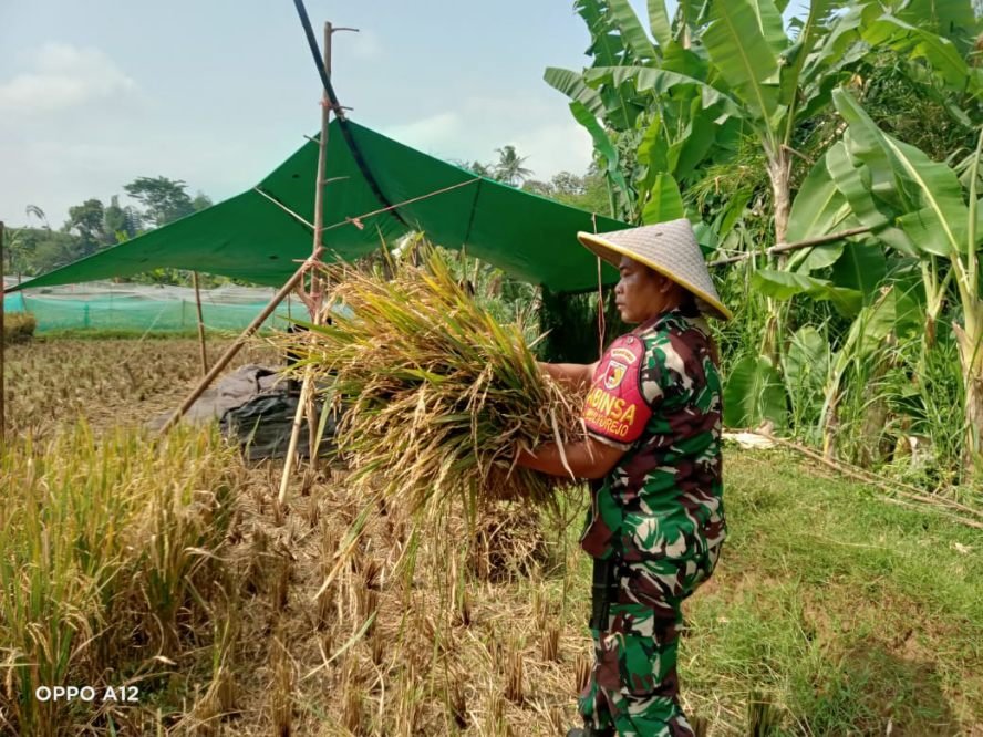 Selain membantu proses panen, Babinsa juga memberikan motivasi pentingnya menjaga kesinambungan produksi pangan di tengah tantangan perubahan iklim dan dinamika harga pasar.