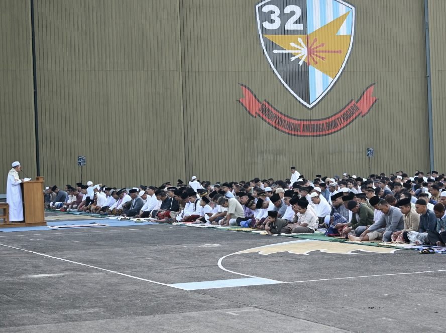 Sketsamalang.com – Danlanud Abd Saleh, Marsma TNI Reza R.R. Sastranegara, S.Sos., M.A.P., MNSS, bersama Ketua PIA Ardhya Garini Cabang 3/D.II Lanud Abd Saleh, Ny. Uphik Reza R.R. Sastranegara, serta masyarakat sekitar, melaksanakan Shalat Iduladha 1446 H/2025 M di depan Hanggar Skadron Udara 32, Jumat (6/6/2025).