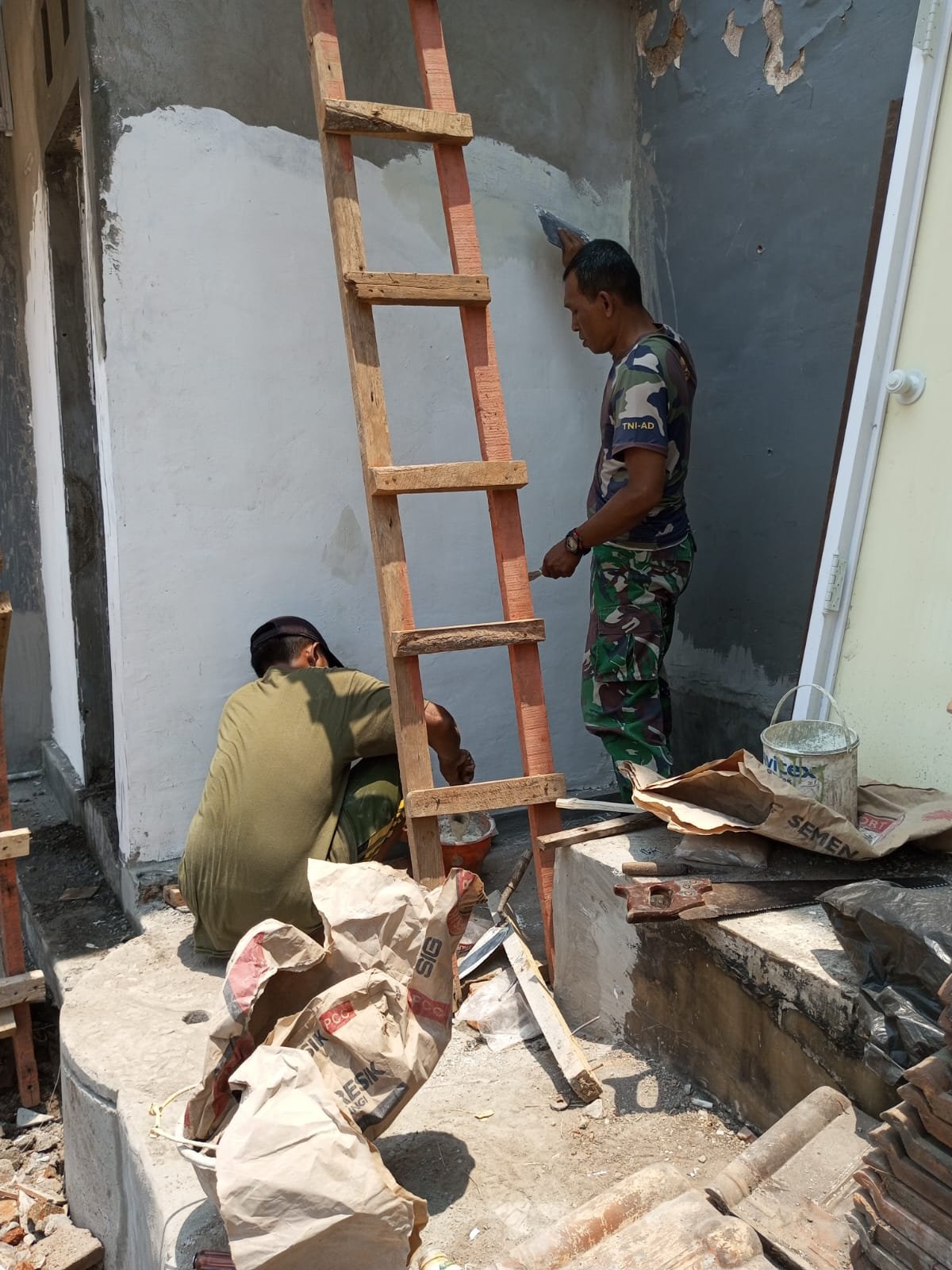 Pelda Edi Santoso sejak pagi tadi membantu membuat jamban bersama anggota Koramil 0833/05 Lowokwaru dan warga membangun jamban. Secara bertahap mulai dari mengaduk campuran, mengangkat Hebel (Bata Ringan ) ke lokasi pembuatan jamban hingga semua dilakukan bersama.