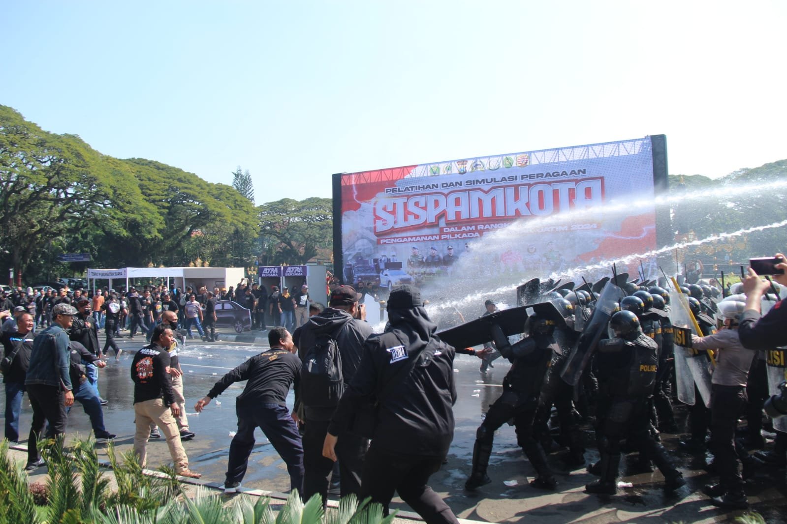 Dalam peragaan sispamkota ini berbagai simulasi pengamanan diperagakan. Seperti halnya penanganan Unras Pilkada yang disimulasikan sampai menimbulkan gesekan / masalah hingga terjadi bentrok antara peserta unras dengan aparat keamanan.