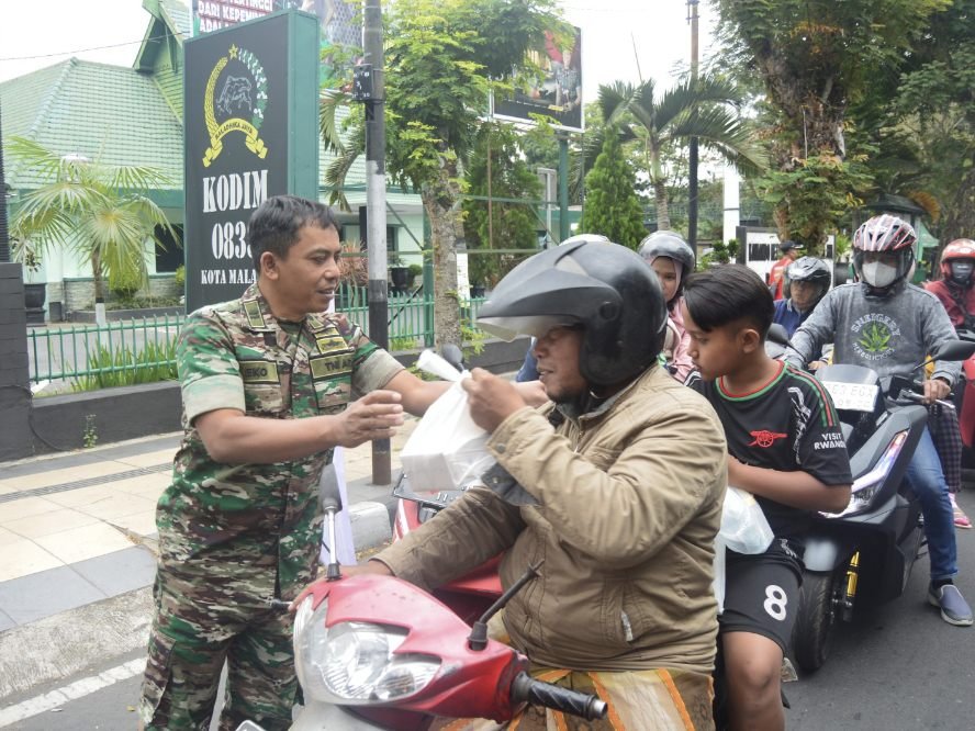 Personel Kodim 0833 bersama jajaran Persit Kartika Chandra Kirana Cabang XL Kodim 0833 tampak antusias mendistribusikan makanan siap saji. Sasaran utama kegiatan ini adalah para tukang becak, pengemudi ojek online, juru parkir serta masyarakat yang melintas.